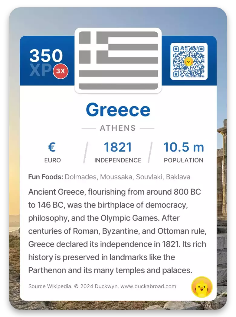 Greece is a country of islands and mountains at the southern tip of Europe. Three thousand years ago, people here built temples to gods they believed lived in the clouds above them. Those temples still stand.