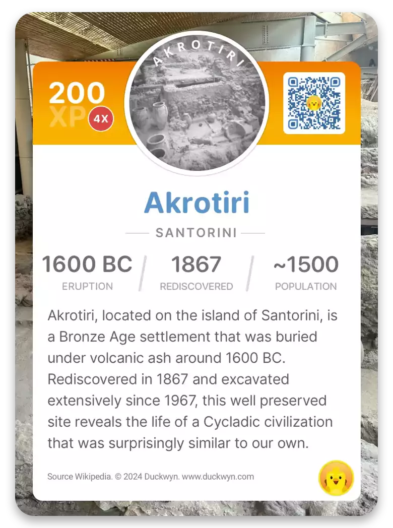 Akrotiri is an ancient town on the Greek island of Santorini. It was a thriving settlement during the Bronze Age, around 4,000 years ago. The Minoan civilization was a bustling port town where people traded goods like pottery, metals, and food with other places in the Aegean Sea.