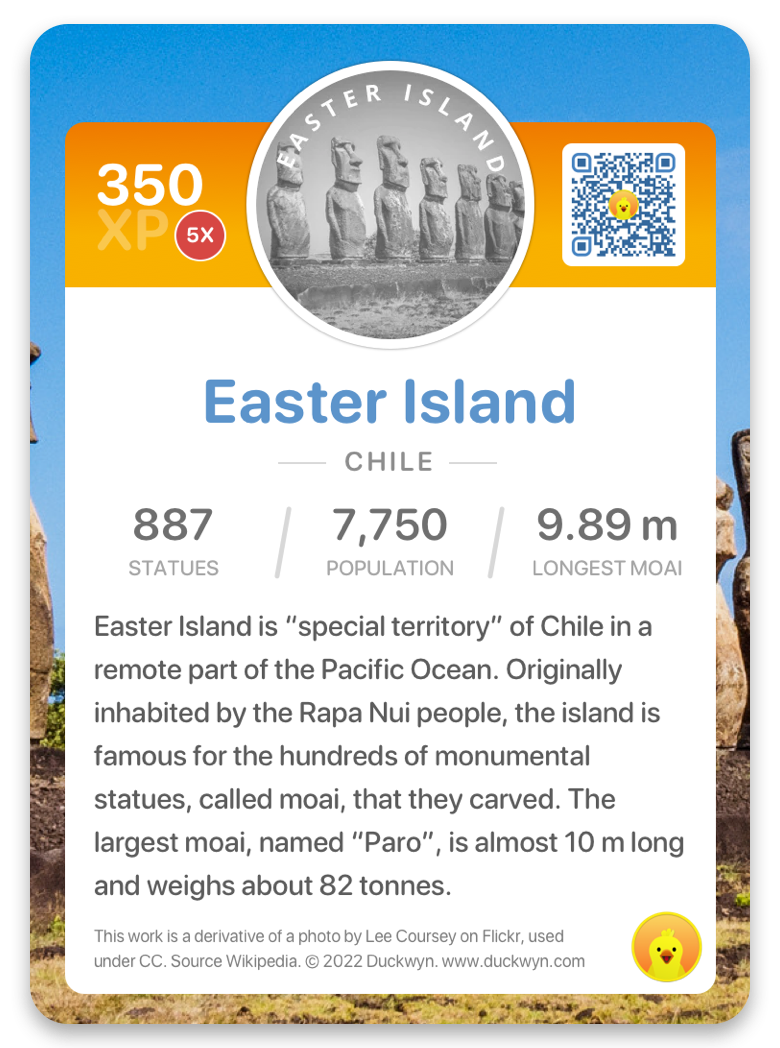 The island is famous for its nearly 900 monumental statues, called moai, which were created by the early Rapa Nui people.